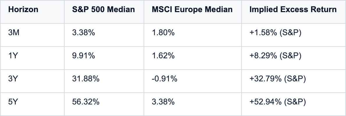 1Y forward: S&P 500 median return of 9.91% vs MSCI Europe’s 1.62%