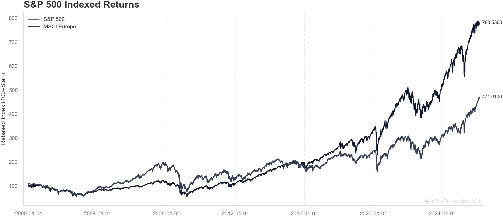 Since the euro’s inception, the S&P 500 has compounded 680% versus MSCI Europe’s 371%—a 309 percentage point cumulative gap. The annualized alpha: 5.75% with a Sharpe ratio of 0.33 versus Europe’s 0.21. Risk profiles diverge: S&P volatility runs 19.0% versus Europe’s 20.4%, with maximum drawdowns of -55% and -63% respectively. The US spent 47% of time at all-time highs; Europe just 33%.