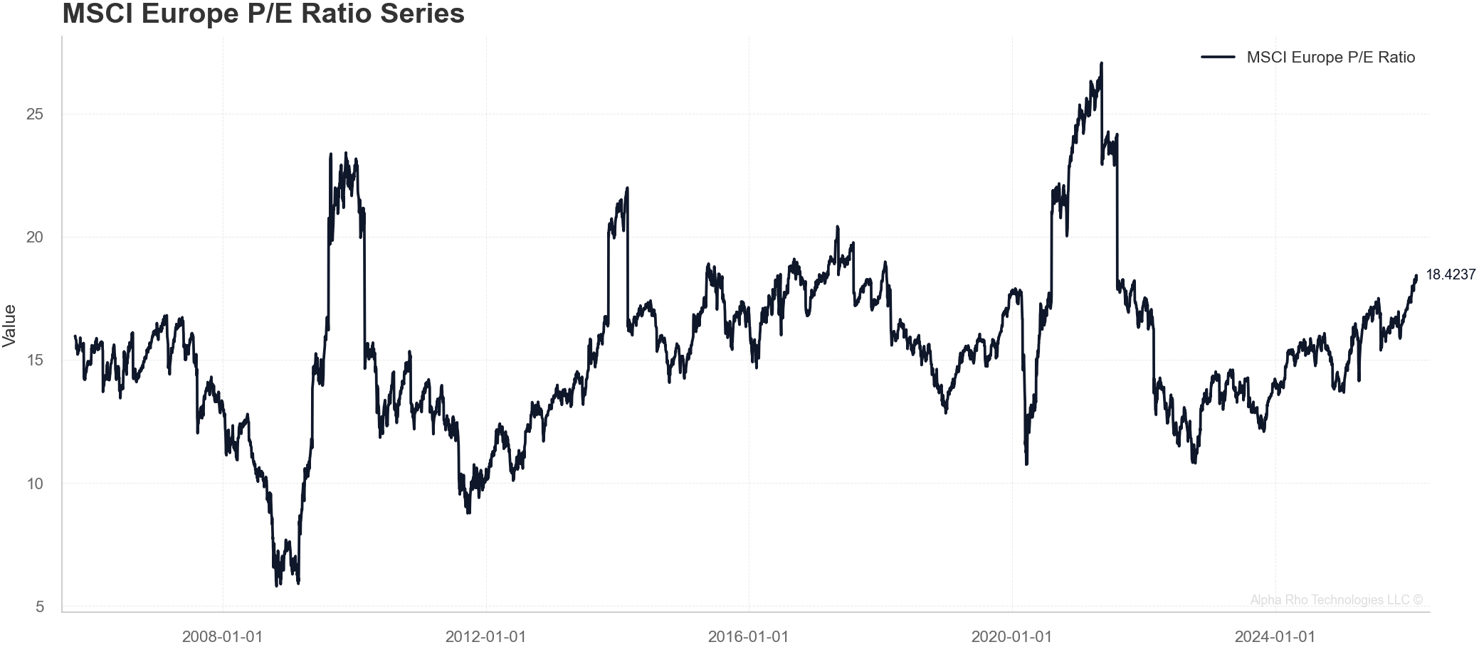 The S&P 500 trades at 27.6x forward earnings; MSCI Europe at 18.4x. That’s a 9.2 turn spread—Europe trades at a 33% discount to the US.
