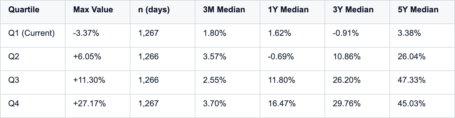The data presents a clear historical pattern. When the trailing 12-month excess return falls into Q1 territory (Europe outperforming by more than 3.37%), forward returns strongly favor the S&P 500 across all horizons. The current reading of -7.79% sits deep within Q1, indicating an extended period of European outperformance that historically precedes US mean reversion.