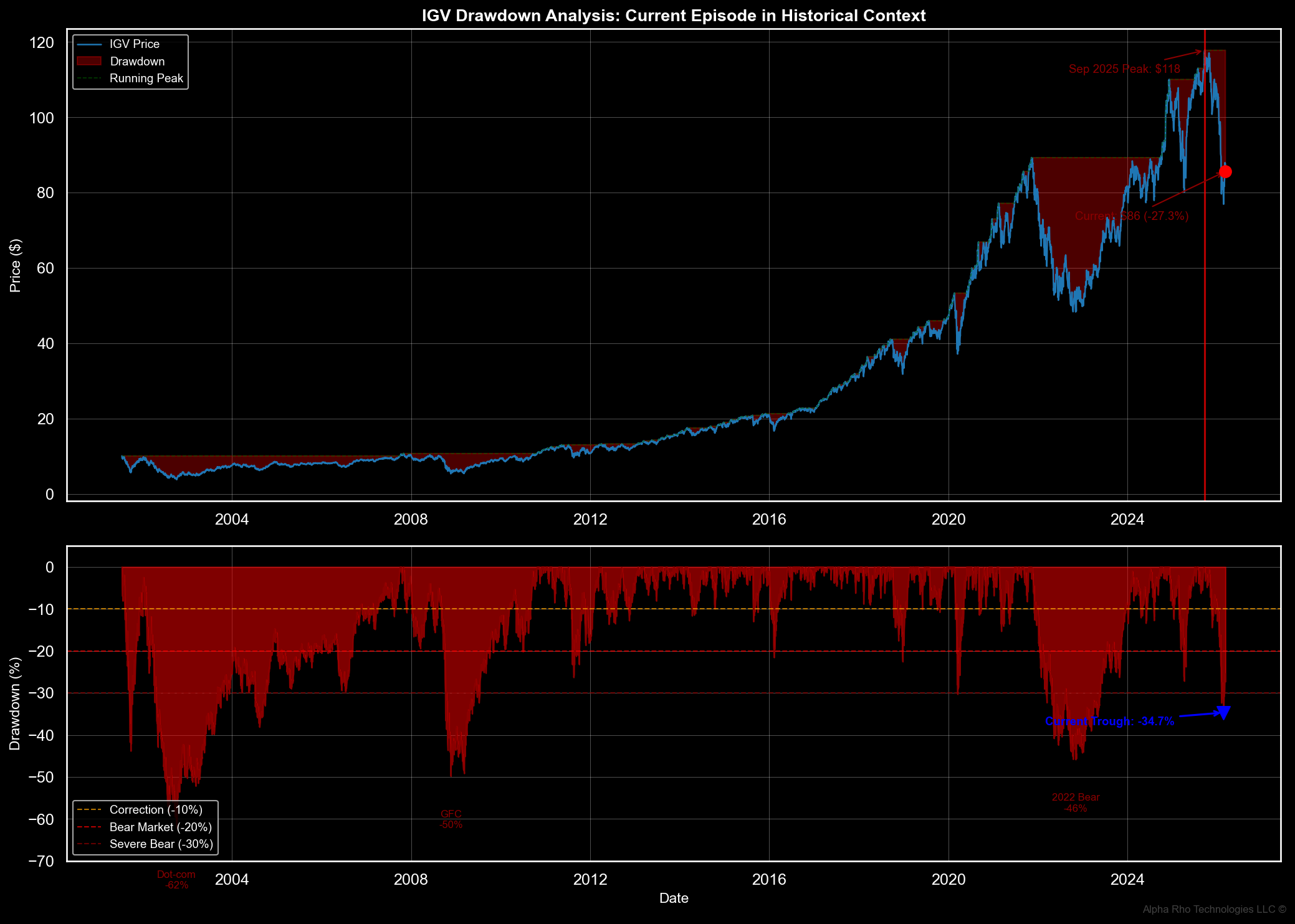Drawdown Regime: IGV’s -34.7% trough depth places it in severe bear territory—exceeded only by dot-com, GFC, and 2022. Historical analogs imply 3+ years to full recovery, not quarters.