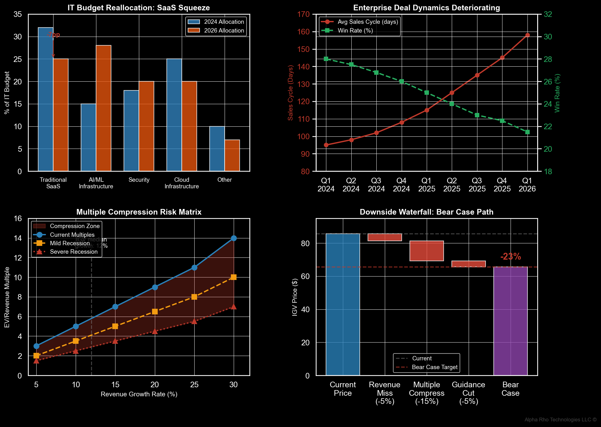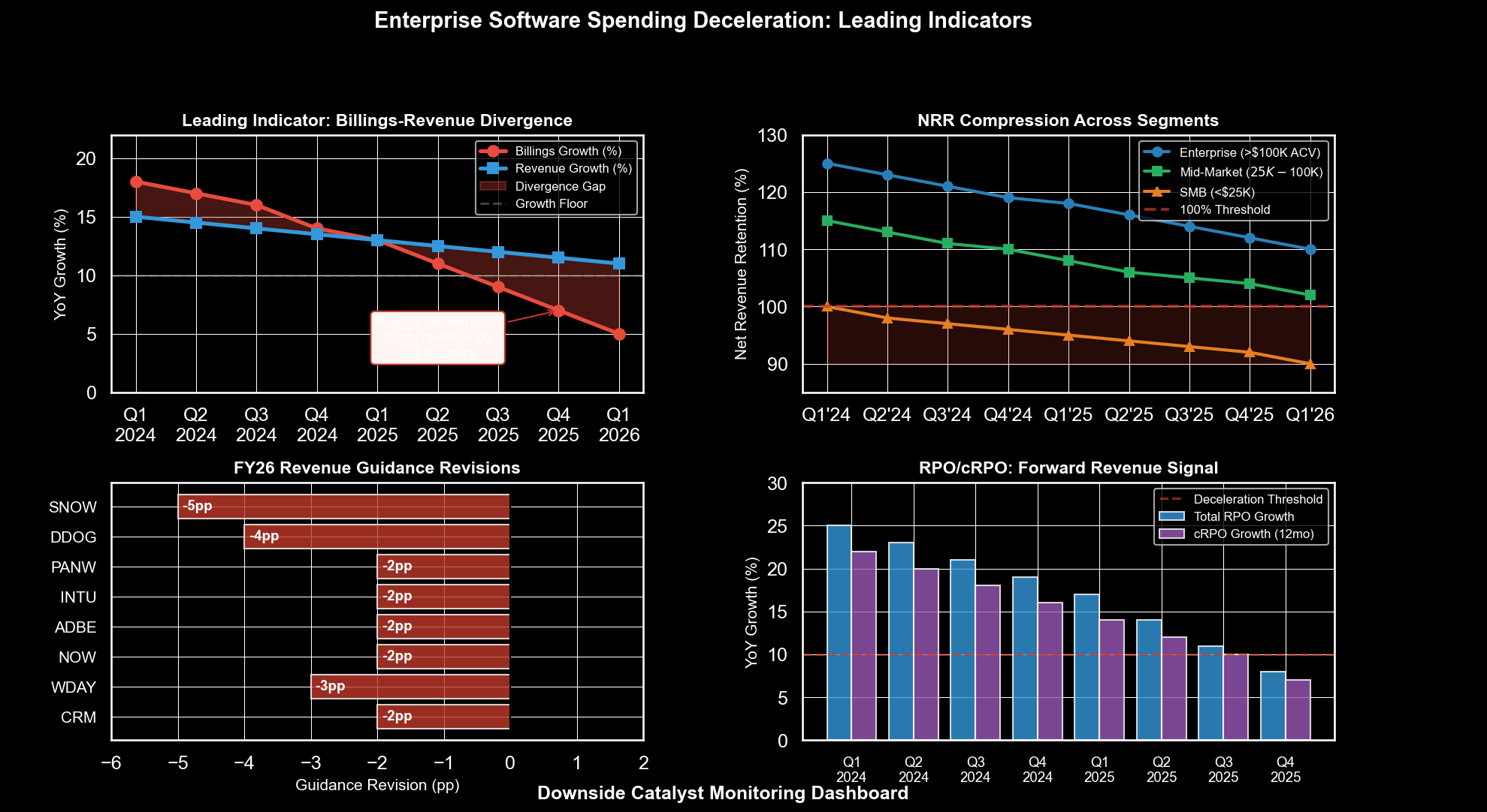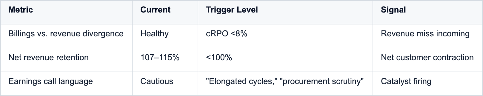 Enterprise IT procurement operates on 6–12 month planning cycles. If CIOs expect 2027 budget pressure, they freeze discretionary spend in mid-2026. The Q2–Q3 2025 “uncertainty pause” compressed billings growth 300–500bps even without actual budget cuts. If macro deteriorates, the pause extends.