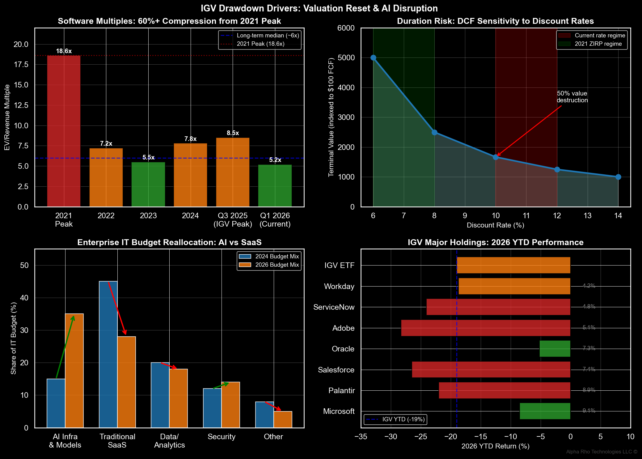 Takeaway: Three structural forces—not cyclical dislocations—are compressing multiples: elevated long rates, AI capex cannibalization, and deteriorating NRR. IGV currently trades at 6.2x forward revenue versus its 5-year median of 9.8x.