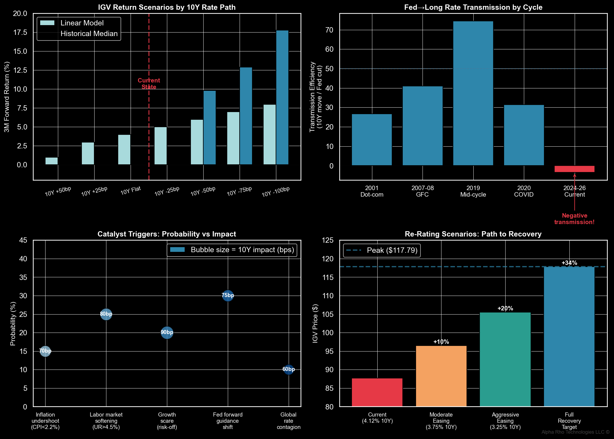 Upside Catalyst: +18% IGV return if 10Y falls 100bps. Transmission has failed this cycle—May 2026 Fed Chair transition (Powell term expiry) creates discrete catalyst window via dovish policy shift expectations. Probability-weighted 3-month return: +5.6%.