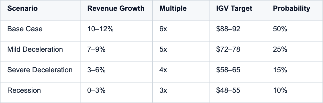 Downside Catalyst: NRR <100% is the exit signal. Systems of record (CRM, WDAY, NOW—35% of IGV) retain pricing power; workflow applications face 8–15% AI cannibalization headwind. Mild IT deceleration implies $72–78 (-16%); severe implies $58–65 (-32%).