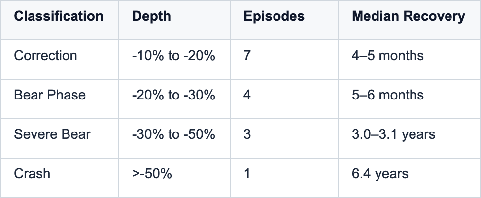 The current episode slots into the severe bear cohort. Average recovery time for this classification: 4.2 years. If historical analogs hold, base case recovery is late 2028 at earliest—assuming no further macro deterioration, earnings growth stabilizes at mid-to-high single digits, and multiples hold current levels.