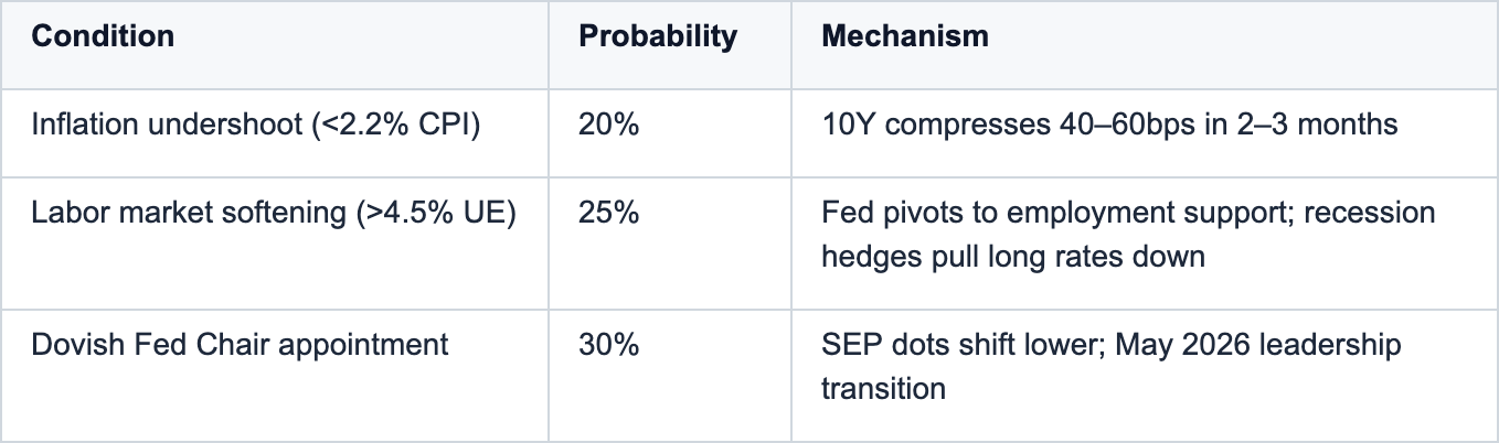 Powell’s term expires May 2026. A dovish successor—or even credible signaling of one—would shift the SEP dot plot lower and compress term premium. The mechanism: markets currently price persistent hawkishness into the long end; a leadership transition signals regime change in the reaction function. If the incoming Chair emphasizes employment over inflation (plausible given political pressure), the 10Y could compress 50–75bps within 3–6 months of appointment clarity. This is the discrete event that breaks the transmission failure.