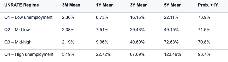 The current Q1 regime delivers positive but sub‑optimal medium‑term returns. Tight labor markets sustain earnings but compress margins and keep policy restrictive, limiting valuation expansion. Strongest multi‑year equity compounding historically occurs after unemployment rises and policy turns accommodative.
