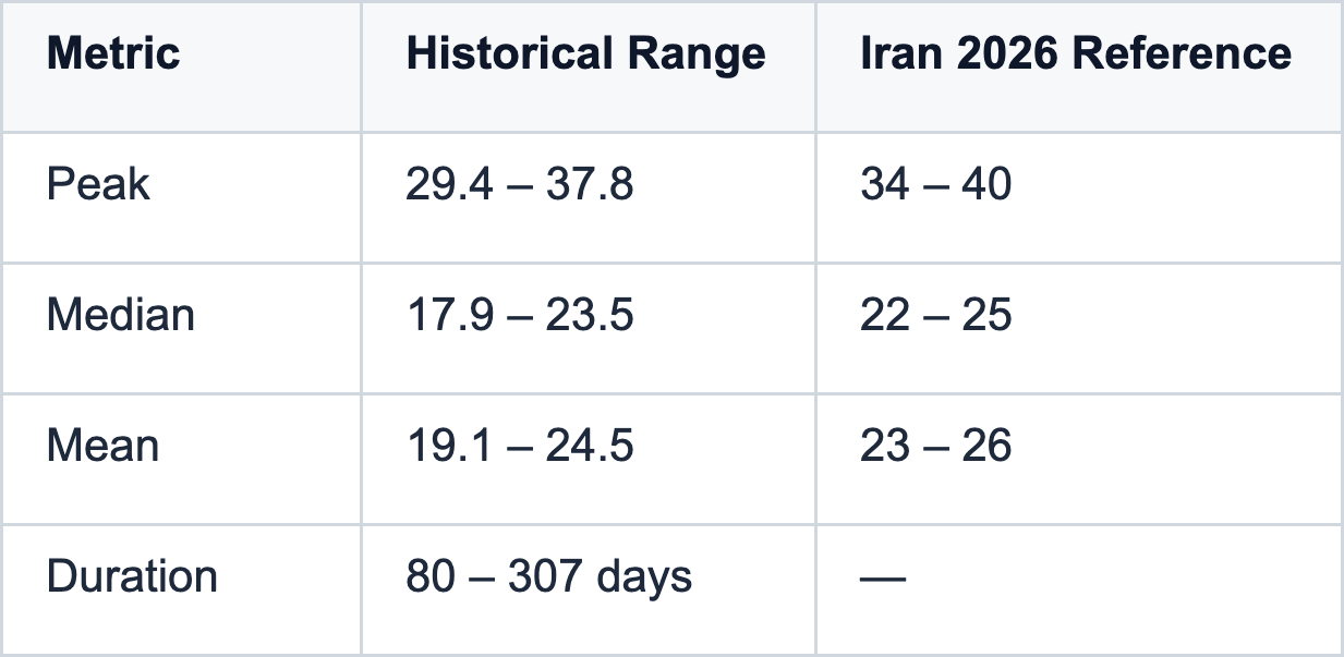 Base case if Iran follows this template: VIX gravitates toward 22–25 central tendency as markets adapt, with periodic spikes into the 30s on escalation headlines