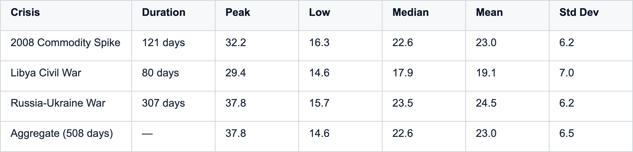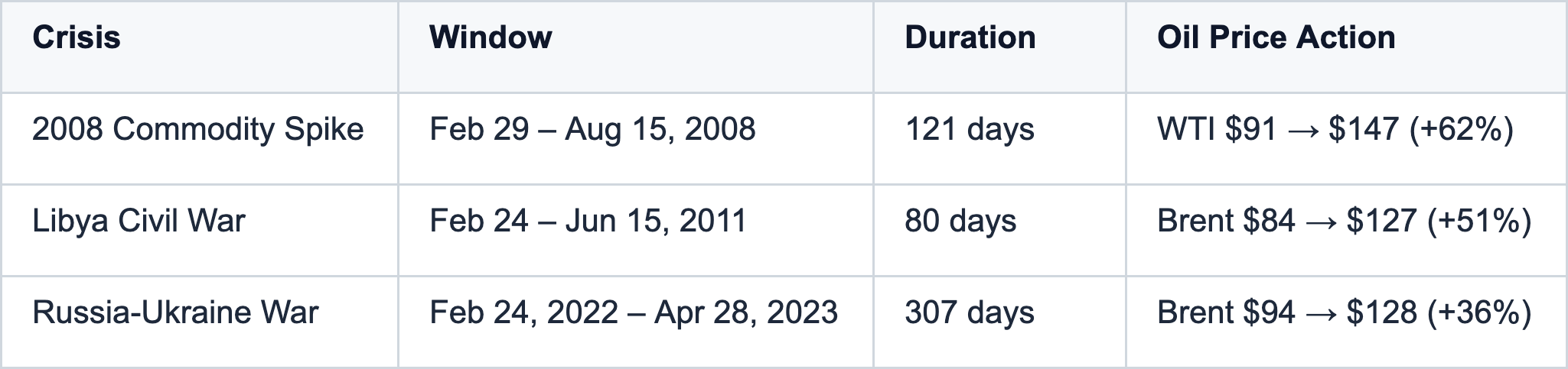 Window selection based on oil price action: start when crude breaches +20% from pre-crisis levels, end when price retraces 50% from peak. This creates mechanically consistent comparison across different crisis types.