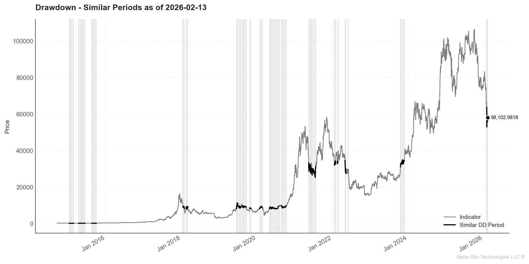 The chart above shows Bitcoin’s historical drawdown regimes. Each colored band represents a different severity level, from 0% (all-time highs) to -50% or worse. Bitcoin currently sits in the -40% to -50% band — marked by the regime you’re entering when losses from peak reach this depth.