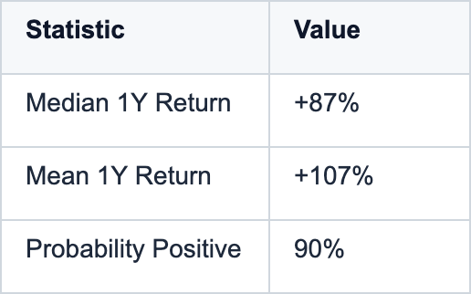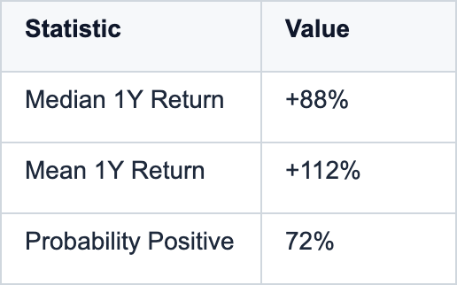 The 12-month picture is where the asymmetry becomes clear. Median returns near +87–88% with win rates of 72–90% reflect the historical tendency for Bitcoin to recover strongly from deep drawdowns. The mean being higher than the median indicates the upside tail is long — some recoveries have been exceptional.