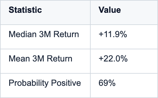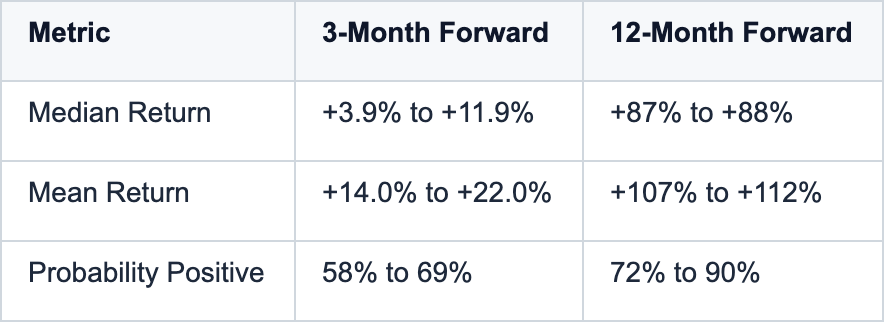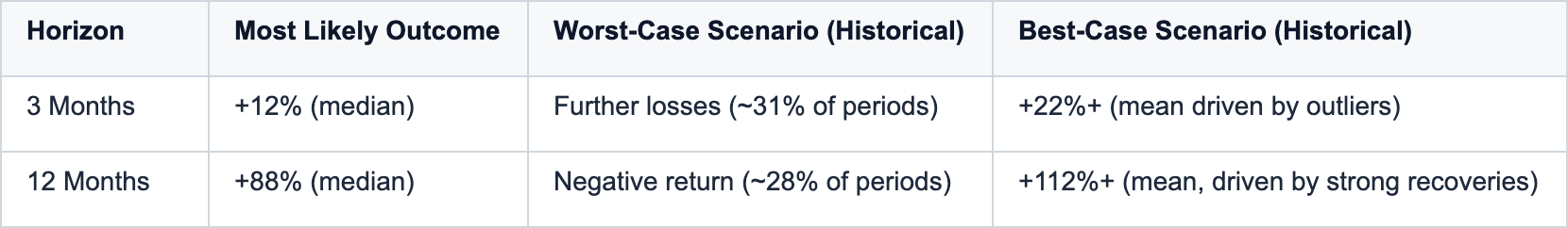 The next quarter is likely to be positive, but not a guaranteed win. Roughly 1-in-3 periods still see further losses over 3 months. Expect choppy price action, not a straight recovery. The mean being nearly double the median signals that some recoveries are explosive, but the typical outcome is more measured.