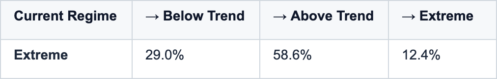 Non-Extreme probability is allocated proportionally to the Below Trend and Above Trend transition shares from the regime’s own 252-day transition matrix.