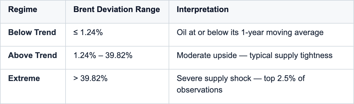 This means: historically, when Brent is in an Extreme deviation state, one year later it has reverted to Below Trend 29% of the time, settled into Above Trend 58.6% of the time, and remained Extreme only 12.4% of the time. The strong pull toward Above Trend reflects the fact that oil shocks tend to partially normalize but leave a residual premium — prices come off the peak but don’t fully round-trip to trend within a year.