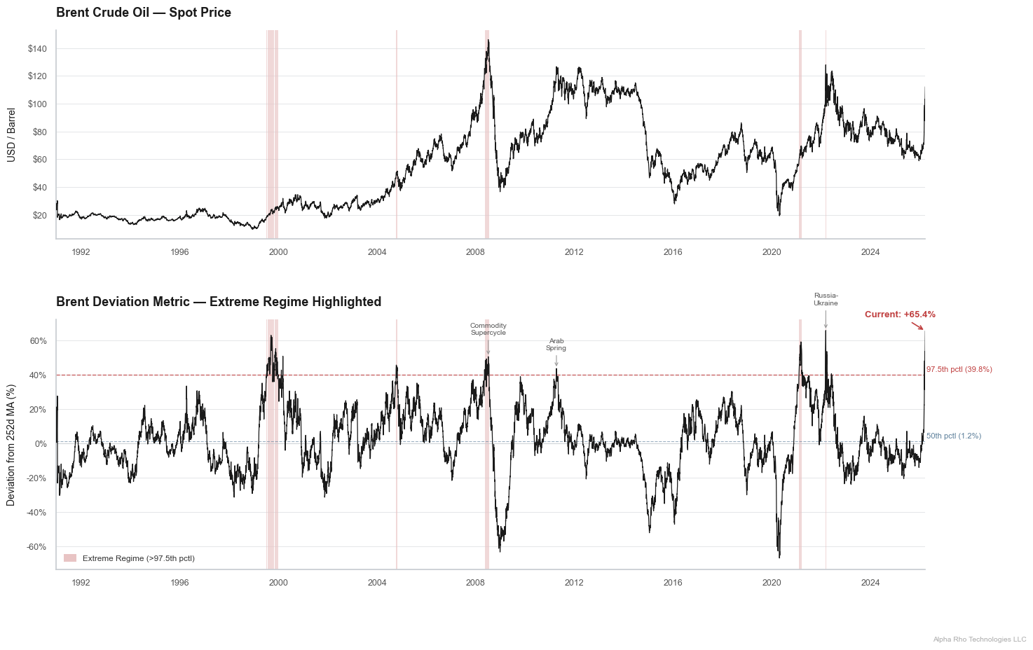 The analysis constructs a Brent crude deviation metric — the percentage gap between Brent’s spot price and its trailing 252-day moving average — computed daily from 1990-12-31 through 2026-03-20 (~9,190 observations). This metric captures how far oil has moved from its own trend, isolating the “shock” component from secular level shifts.