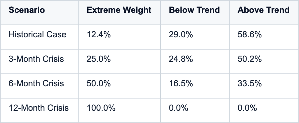 Four duration-weighted conditional distributions blend the three regime return distributions according to how long Extreme conditions persist over the coming 12 months: